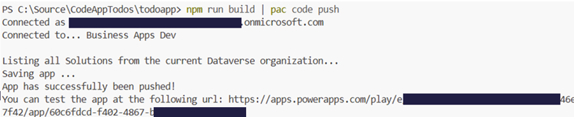 npm run build | pac code push