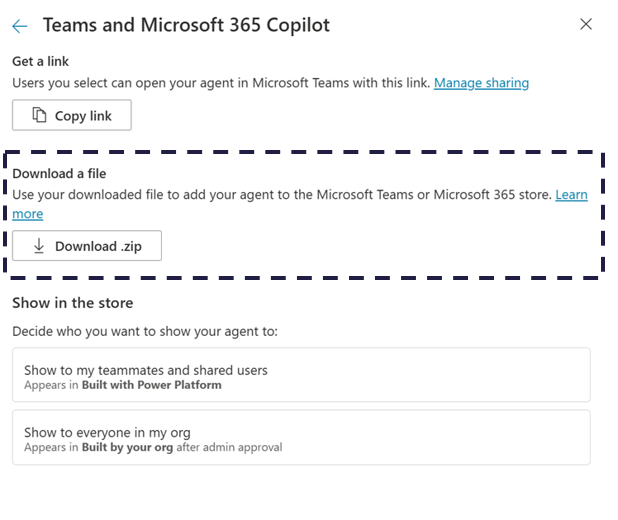 Next, I enabled publishing to Teams and Microsoft 365 Copilot.Through the availability options menu, Copilot Studio lets you download the app manifest for distribution.